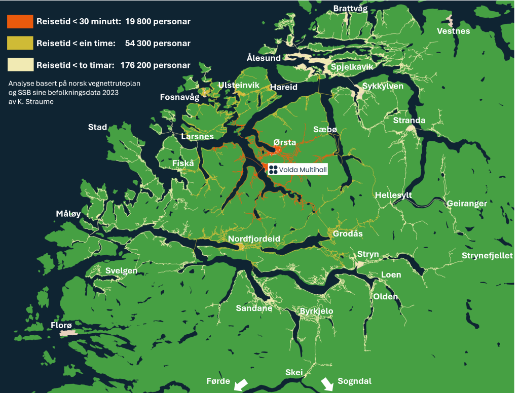 Analysa av reisetid for å kome seg til Volda Multihall viser at